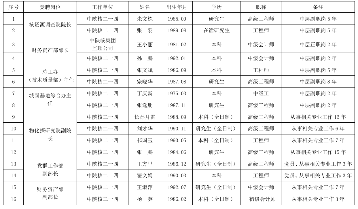 根據(jù)中陜核工業(yè)集團(tuán)二一四大隊(duì)有限公司《中層管理人員選聘工作方案》有關(guān)要求,現(xiàn)對資格審查通過的報(bào)名人員予以公示: