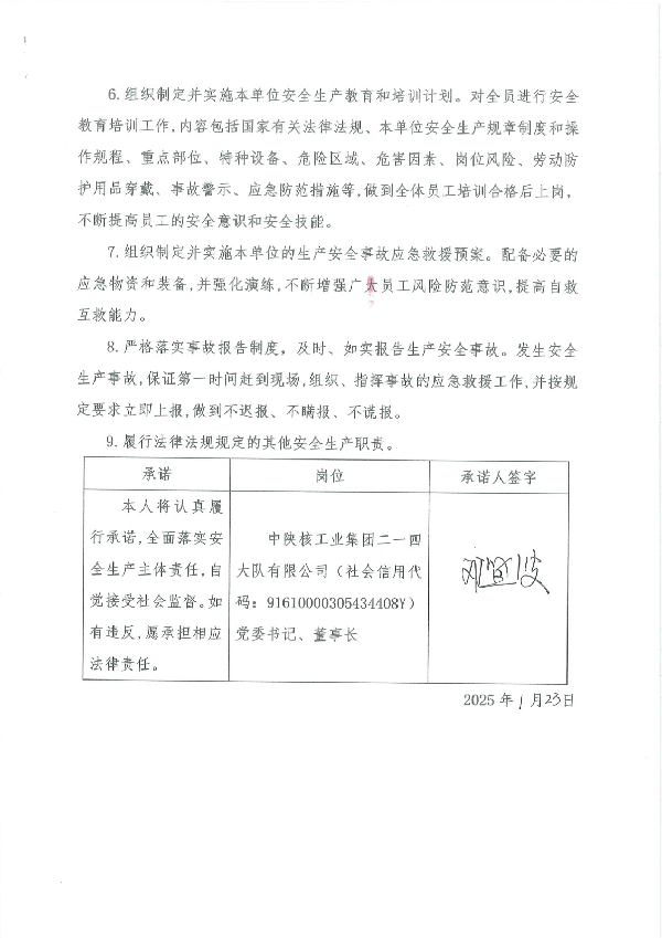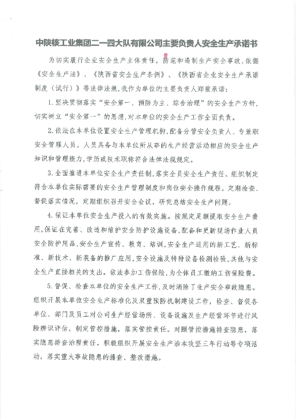 中陜核工業(yè)集團(tuán)二一四大隊(duì)有限公司主要負(fù)責(zé)人安全生產(chǎn)承諾書(shū)