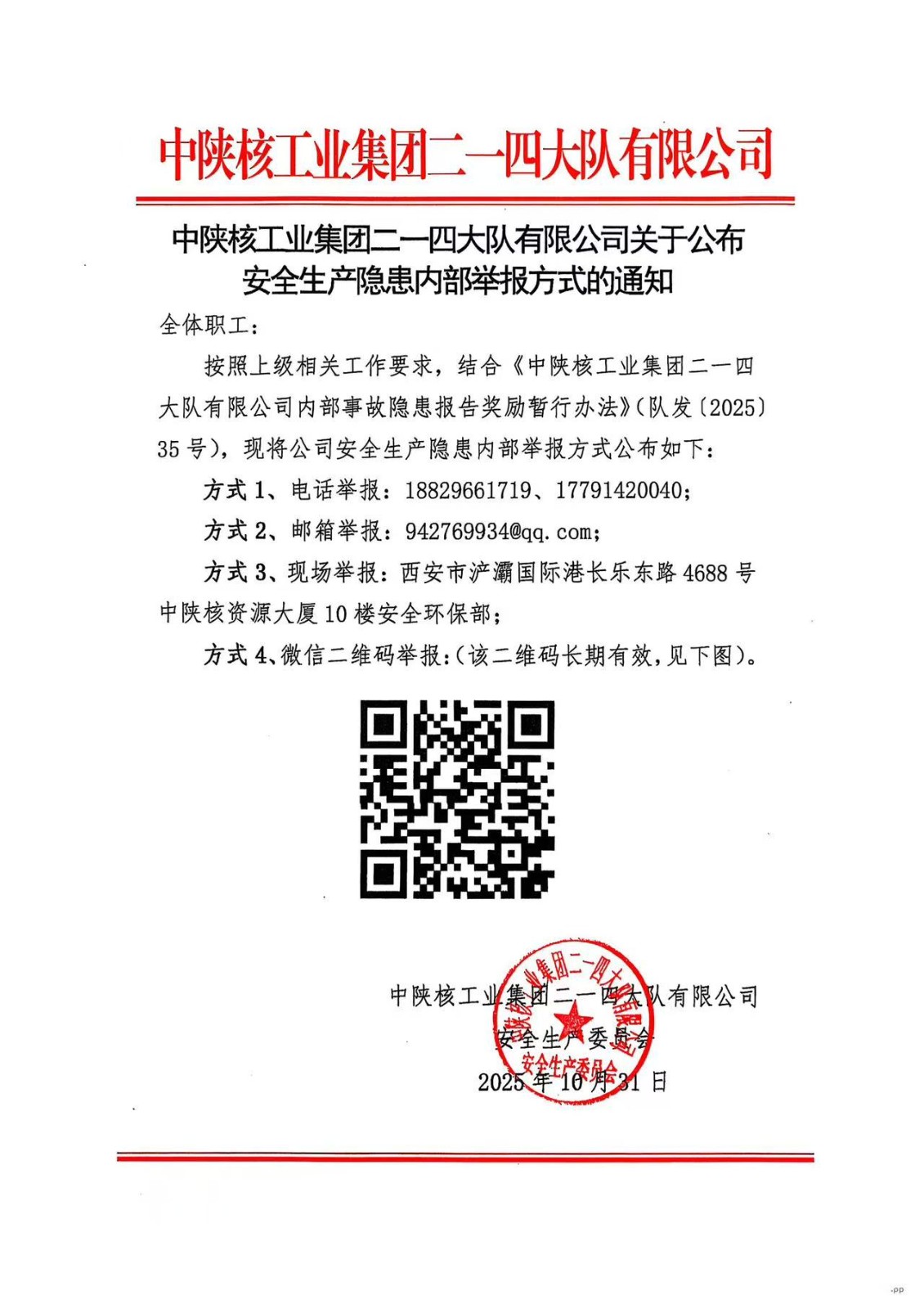 中陜核工業集團二一四大隊有限公司關于公布安全生產隱患內部舉報方式的通知
