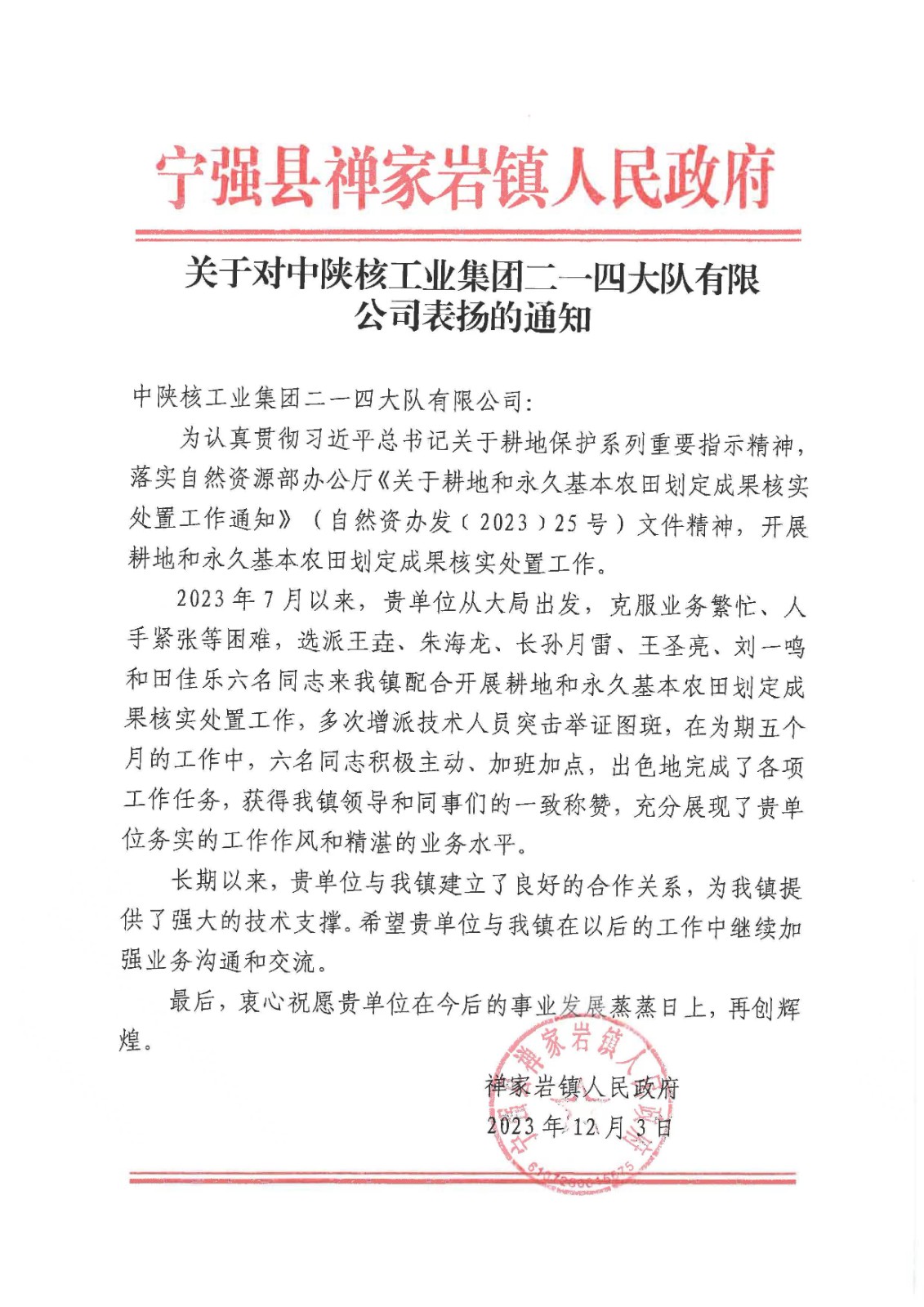 該通知是由漢中市寧強縣禪家?guī)r鎮(zhèn)人民政府發(fā)布,主要是對我公司2023年7月以來,從大局出發(fā),克服業(yè)務繁忙、人手緊張等困難,選派王垚、朱海龍、長孫月雷、王圣亮、劉一鳴和田佳樂六名同志配合禪家?guī)r鎮(zhèn)開展耕地和永久基本農(nóng)田劃定成果核實處置工作,多次增派技術(shù)人員突擊舉證圖斑,在為期五個月的工作中,六名同志積極主動、加班加點,出色地完成了各項工作任務表示稱贊,同時對公司一線技術(shù)人員務實的工作作風和精湛的業(yè)務水平表示肯定。
