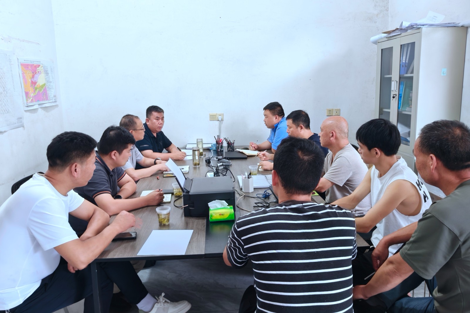 為北溝項目野外一線職工送來了防暑慰問品后,司金強一行聽取了項目負責(zé)人孫德對項目基本情況及最新找礦成果匯報,王朋對項目技術(shù)資料質(zhì)量進行全面檢查,對做好第一期野外驗收工作提出了要求,要提高工作效率,狠抓項目進度,嚴把質(zhì)量關(guān),及時整理項目資料。安保部重點對近期嚴峻的防汛工作及項目外包作業(yè)進行安全檢查,強調(diào)了近期防汛工作的重要性,要時刻關(guān)注天氣情況及地質(zhì)災(zāi)害預(yù)警信息,做好防汛預(yù)案和人員職責(zé)分配,通過檢查指出了外包作業(yè)資料不全等問題,要求項目部及時整改。行政部重點強調(diào)資料保密工作,提高保密工作意識,嚴禁網(wǎng)上傳送保密文件,加強資料管理,要求資料及時歸檔,加強車輛管理,公車使用嚴格執(zhí)行公司規(guī)章制度,嚴禁公車私用。