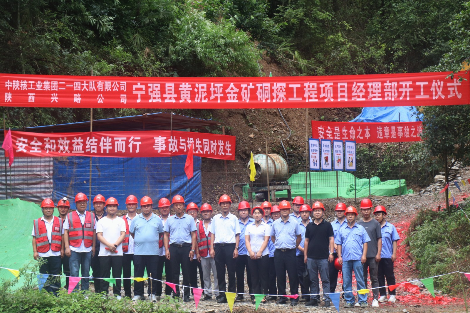近日,公司寧強(qiáng)縣黃泥坪金礦詳查項(xiàng)目硐探工程已完成機(jī)械安裝、開硐檢查、安全驗(yàn)收等準(zhǔn)備工作。8月3日下午,公司黨委書記、董事長(zhǎng)鄧盛波,黨委副書記、總經(jīng)理司金強(qiáng)和公司副總經(jīng)理、總工程師王朋,前往施工現(xiàn)場(chǎng)檢查各項(xiàng)準(zhǔn)備工作并參加了硐探開工儀式。