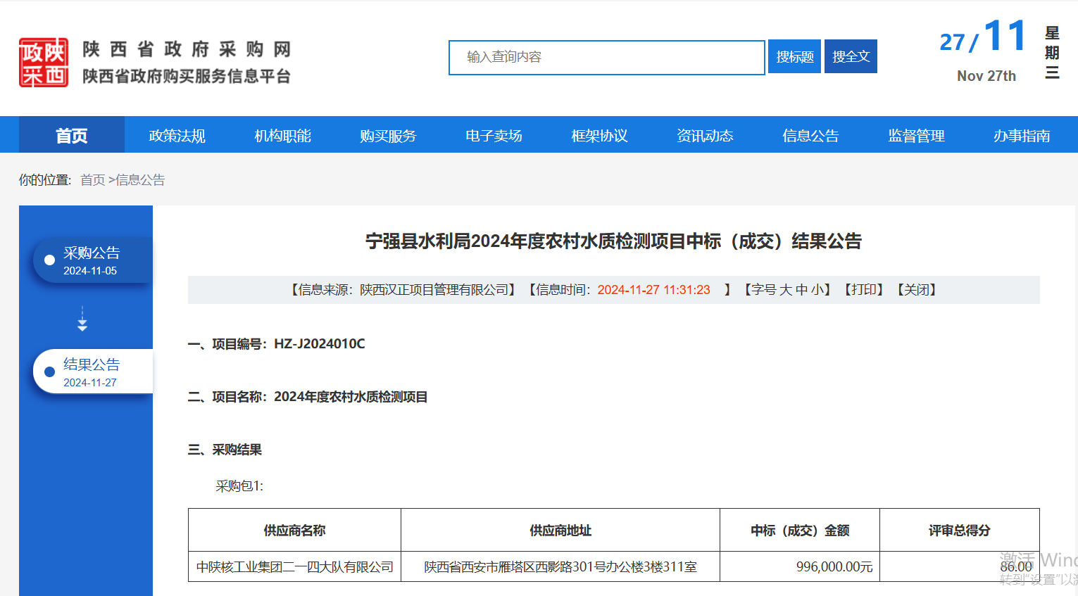1127日,公司物化探院成功中標寧強縣水利局2024年度農村水質檢測項目第一標段,中標金額99.6萬元整
