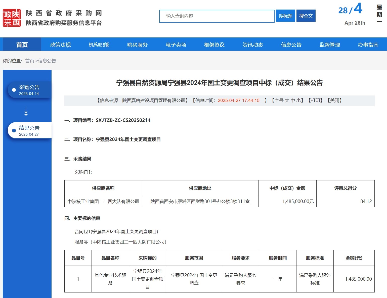4月27日,公司物化探院成功中標(biāo)《寧強(qiáng)縣2024年國土變更調(diào)查項(xiàng)目》,這一喜訊標(biāo)志著公司在國土調(diào)查領(lǐng)域的專業(yè)技術(shù)實(shí)力獲得認(rèn)可,也將為寧強(qiáng)縣自然資源管理工作增添新動(dòng)能。