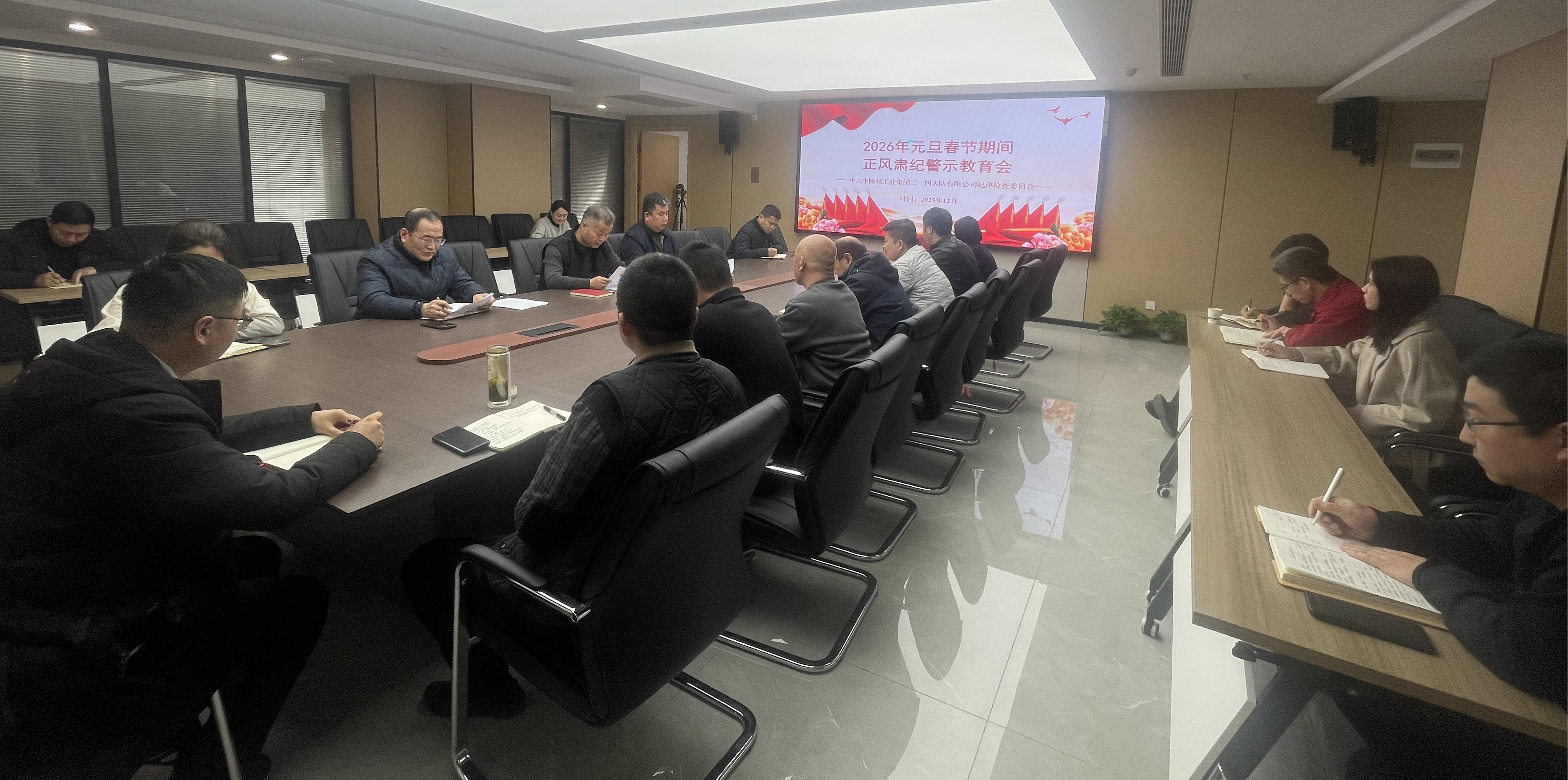 12月26日下午,為深入貫徹落實中央紀(jì)委正風(fēng)肅紀(jì)工作要求,營造風(fēng)清氣正的節(jié)日氛圍,中陜核二一四隊召開2026年元旦春節(jié)期間正風(fēng)肅紀(jì)警示教育會。公司領(lǐng)導(dǎo)班子成員,中層干部、各黨支部書記及支部紀(jì)檢委員參加了會議。會議以敲警鐘、明紀(jì)律、劃紅線全面部署節(jié)日期間正風(fēng)肅紀(jì)工作,也為2026年工作順利開展及"十五五"高質(zhì)量開局提供有力紀(jì)律保障。