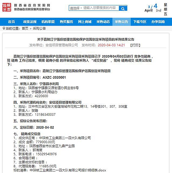 2020年4月3日,從陜西省政府采購網獲悉,公司成功中標“嘉陵江寧強段管理范圍和保護范圍劃定項目”。