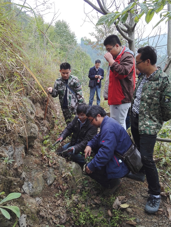 到達項目部,領導專家們首先對項目目前工作開展情況進行了細致了解,隨后在項目人員的陪同下到野外現場實地踏勘,對車渡地段AuⅧ-1礦體的不同礦段進行詳細的觀察研究,并與項目技術成員就礦床成因及成礦規律現場進行了探討交流。