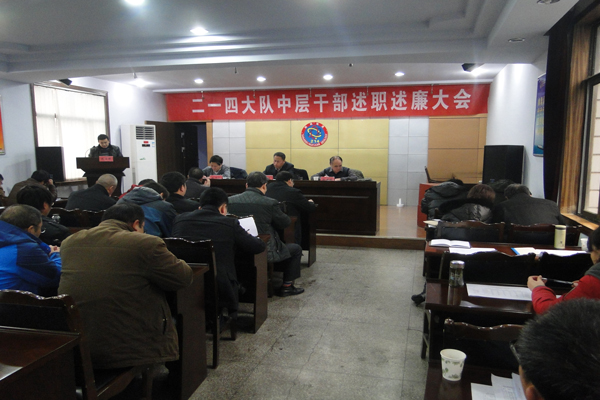 為全面了解、掌握大隊中層干部2014年度的工作情況以及在職工中的公認(rèn)度,進一步加強干部思想作風(fēng)和工作作風(fēng)建設(shè),努力打造一支政治堅定、業(yè)務(wù)過硬、作風(fēng)過硬的干部隊伍, 2015年1月5日上午,二一四大隊在城固基地三樓會議室舉行了中層干部述職述廉大會。大會由紀(jì)委書記楊乃讓同志主持,大隊班子成員、大隊中層干部和機關(guān)、經(jīng)營單位職工共86人參加了此次會議。