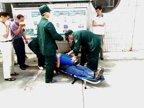 下午4點演練正式開始,隨著模擬火源的點燃,樓內有人呼喊“著火了,著火了”,隨后報警鈴聲驟然響起。按照應急預案程序,綜合協調組在現場應急指揮部的指揮下安排各組人員迅速到位,第一時間撥打了119(模擬)、職工醫院急救電話。疏散救護組快速組織樓內人員有序的向安全地方撤離,濃煙彌漫中被疏散人員紛紛用濕毛巾捂住口鼻,采取彎腰低姿勢向樓下迅速撤離。與此同時,滅火組人員手提滅火器,接通消防水帶,迅速向烈焰噴射滅火。警戒組在火場30米外快速設置警戒線,疏通應急通道,防止人員倒流。演練開始2分鐘后,全部人員撤離到警戒線外的安全地帶;4分鐘后,搜救人員將一名被困現場的重傷員救出,隨后職工醫院救護車來到現場,在救護組人員的協助下醫生現場對傷員進行搶救,并送往醫院救治;20分鐘后,大火被撲滅,演練圓滿結束。