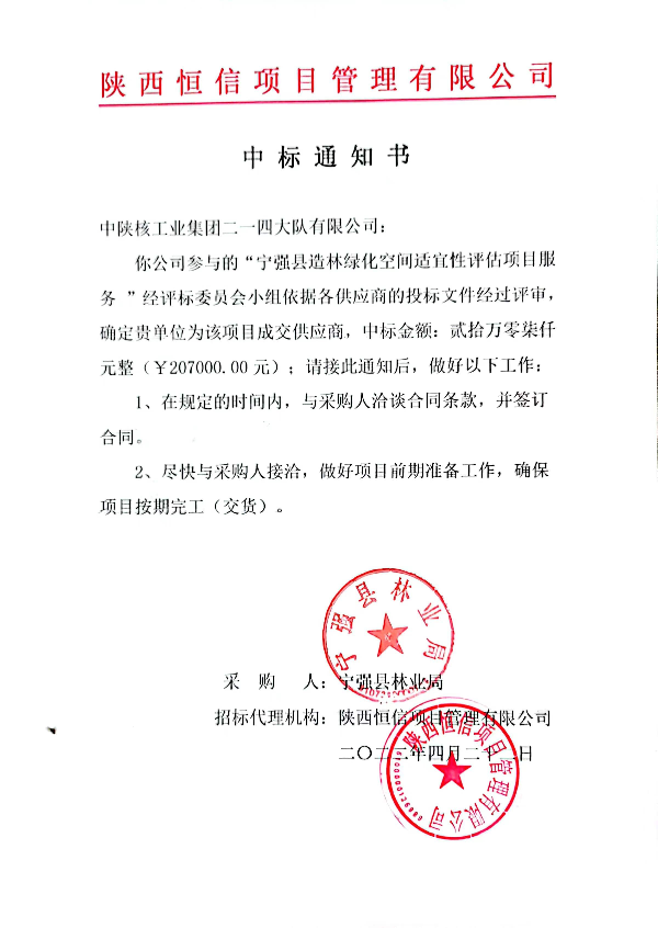 近日,接招標代理機構成交通知書,公司成功中標《寧強縣造林綠化空間適宜性評估項目》。