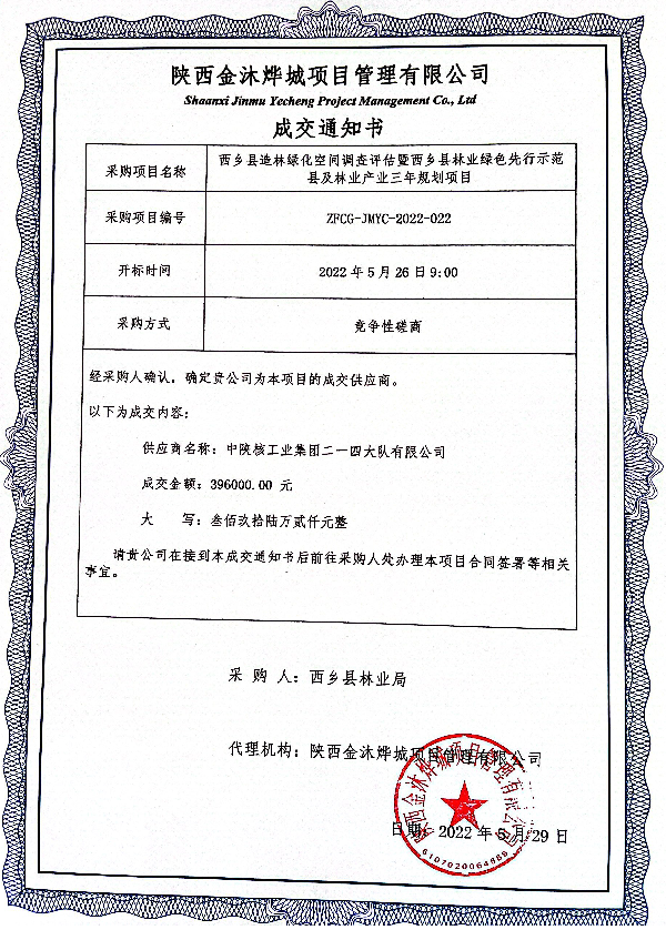 530日,接招標代理公司通知,公司成功中標《西鄉縣造林綠化空間調查評估暨西鄉縣林業綠色先行示范縣及林業產業三年規劃》項目。