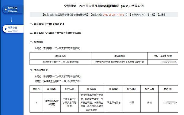 8月22日,從陜西省政府采購網(wǎng)獲悉,公司成功中標《寧強縣第一次水旱災害風險普查項目》。