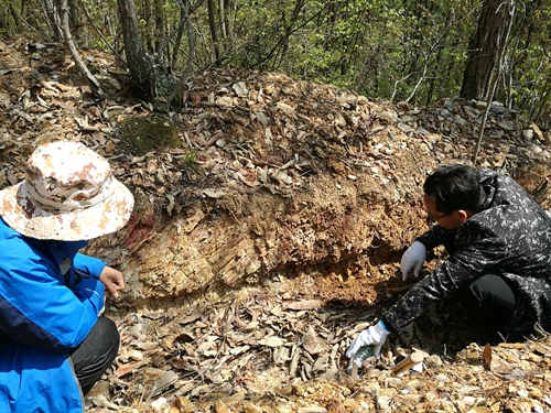 12日上午,王義忠到項(xiàng)目部后先聽取了項(xiàng)目人員對該區(qū)工作進(jìn)展情況的匯報,然后深入野外一線實(shí)地指導(dǎo),檢查探槽工程施工編錄質(zhì)量、追索異常源、尋找礦化信息。